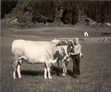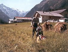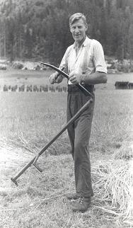 Josef Schneider sen. beim "Wetzen" der Sense (1959)